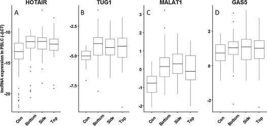 Fig. 1. Association between PAHs exposure and lncRNA expression in PBLCs of the subjects. The PAHs-exposed workers were divided into three subgroups as bottom, side, and top oven, where the level of PAHs exposure went up from bottom to top. LncRNA expression was tested by qRT-PCR method. The horizontal line in the box represents the median of each subgroup. (A) HOTAIR, Ptrend < 0.001; (B) TUG1, Ptrend = 0.002; (C) MALAT1, Ptrend < 0.001; (D) GAS5, Ptrend = 0.809. |