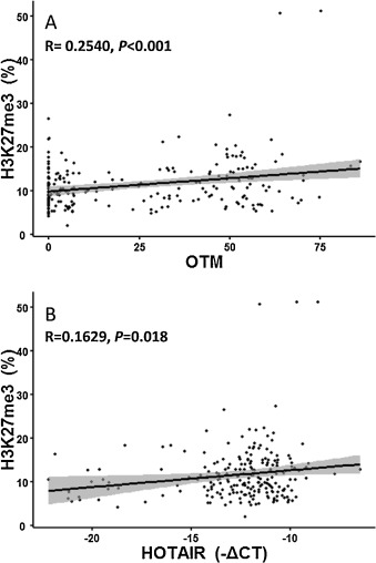 Fig. 3. Enhanced H3K27me3 modification was correlated to the degree of DNA damage and upregulation of HOTAIR expression. The modification of H3K27me3 was examined by ELISA. The degree of DNA damage was indicated by Olive tail moment (OTM) from Comet assay. LncRNA expression was tested by qRT-PCR. (A) Association of H3K27me3 modification with OTM in PBLCs of all subjects. y = 0.0606x + 9.9009, R = 0.2540, P < 0.001. (B) Association of H3K27me3 modification with HOTAIR expression in PBLCs of all subjects. y = 0.0182x + 16.5407, R = 0.1629, P = 0.018. |
