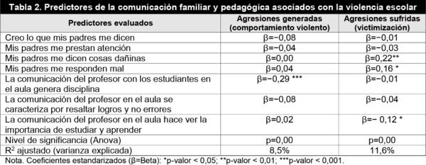 Un análisis de regresión aplicado a estas variables que correlacionaron significativamente permitió identificar los predictores de la comunicación familiar y pedagógica que influyen en la violencia escolar entre adolescentes.
