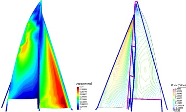 Figura 11. Resultados de los análisis computacionales del velero Totalmar GP42 (izquierda: desplazamientos; derecha: coeficiente de presión). |