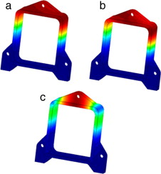 Figura 6. Resultados del campo de desplazamientos en el modelo FEM. De izquierda a derecha: carga 4,5 kN-29°, 2,25 kN-13° y 2,25 kN-0°. |