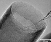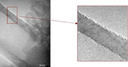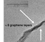 El grafeno obtenido por un procedimiento top down se produce principalmente a partir de grafito, aunque también se pueden emplear otros precursores grafíticos. El principal inconveniente del grafito como material de partida es la baja eficiencia del proceso de exfoliación debido al elevado número de capas apiladas presentes en su estructura y el gran tamaño lateral del grafeno obtenido para ciertas aplicaciones. Como ruta alternativa, ANTOLIN ha desarrollado procesos físico-químicos para obtener láminas de grafeno y óxido de grafeno de pocas capas usando sus propias nanofibras GANF (Grupo Antolin NanoFibers) como material de partida. Estas nanofibras presentan una singular estructura grafítica helical ribbon, formadas por cintas grafíticas de aproximadamente cinco capas de grafeno enrolladas alrededor del eje de la fibra (Figura 1) [3]. Esta estructura las hace muy atractivas como material de partida para la producción de grafeno [4,5]. El bajo número de capas de grafeno apiladas en GANF permite obtener una exfoliación muy efectiva de las láminas de grafeno con un tamaño lateral suficientemente pequeño para evitar el efecto filtrado reportado por Zhang et al. [6] durante el proceso de fabricación de laminados mediante moldeo por transferencia de resina (RTM).