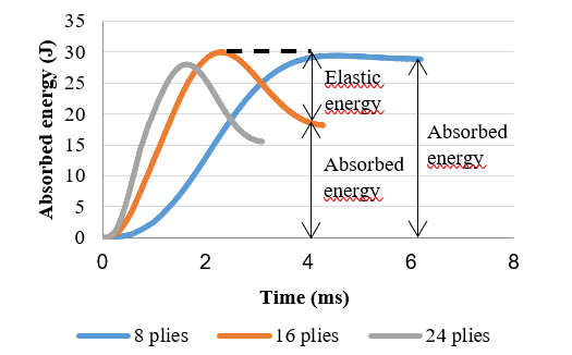 Generally, the impact energy is absorbed in two different ways in a composite material: as elastic deformation and as dissipated energy in form of permanent damage. At the beginning of the test, the energy curve rises until its maximum value which is connected to the impact energy. Once the absorbed energy-time curve reaches the maximum value, two different performances are possible: