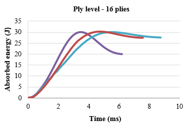 b) If there is no penetration in the material, the energy decreases until it becomes stable. The value of energy at the end of the test corresponds to the permanent absorbed energy through various damage mechanisms as delamination, matrix cracking or fiber breakage [9]. The difference between the impact energy and the absorbed energy is named excessive energy and it is the responsible for the impactor rebound [10]. In other words, the excessive energy produces elastic deformation in the laminate. This is the case for the 16-ply and 24-ply laminates in Fig. 3.