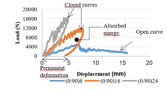 Fig. 5 represents three typical force-displacement curves encountered in an impact event. The first part of the curve is linear and represents the stiffness of the non-damaged laminate. The second part of the curve can perform in two different ways resulting in closed and open type curves, respectively. Open type force-displacement curves have a horizontal section at the end due to damage perforation in the specimens. 8-ply laminate in Fig. 5 shows an open force-displacement curve. In contrast, for specimens having rebounding there is an elastic recovery because the impact energy is unable to cause perforation and both, force and displacement decrease resulting in closed curves in which the enclosed areas represent the absorbed energy [12]. 16-ply and 24-ply laminates in Fig. 5 show closed force-displacement curve.