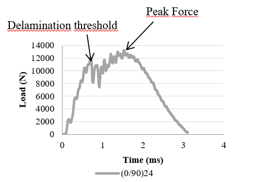 The contact force is the response of the laminate to the force applied by the impactor [5], see Fig. 2. Contact force histories are registered and represented in the force-time diagram. Several smooth fluctuations in the curve indicate the presence of damage [6] whereas the first abrupt drop in the curve corresponds with the delamination initiation when the stiffness of the laminate falls suddenly because of the impact damage [7]. The maximum force value in the diagram is named peak force and indicates the highest damage caused [8]. After that point, the curve presents a lower slope as a result of a strength decrease.