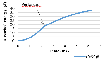 In the case that penetration occurs, the curve of energy performs in a different way. The penetration energy is located at the point where the curve remains almost constant in the force-time diagram but the energy increases with a constant rate as a result of the friction between the impactor and the perforation edges. A typical absorbed energy-time curve with penetration for a [0/90]2s laminate is presented in Fig. 4.