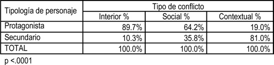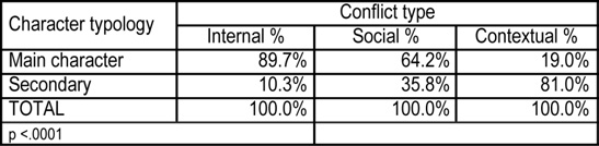 Finally, 30.05% of the conflicts analysed were classified as contextual conflicts. These were incidental conflicts where the character had no real role. This conflict typology, where the character was a mere spectator in the narrative, was usually linked to secondary characters (81%) that were often in the background of the plots involving the main characters. This data is shown in Table 2, which shows that internal conflict is more frequently associated with main characters than secondary ones.