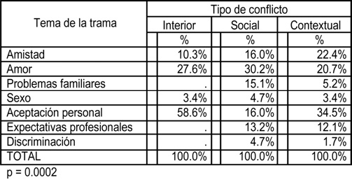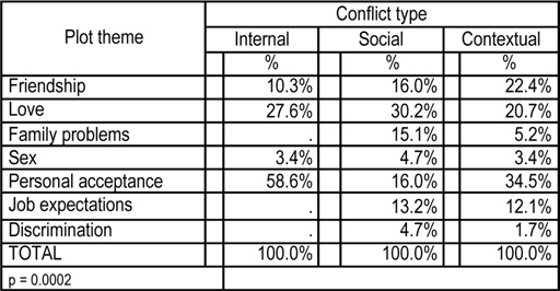 El conflicto interior es casi exclusivo del grupo adolescente (93,1%), y se asocia sobre todo a las tramas de aceptación personal y en segunda instancia a las que corresponden a la temática amorosa, como se puede observar en la tabla 3. En cambio, el conflicto de tipo social tiende a asociarse más a las tramas de amor, aunque se distribuye de manera más equilibrada dentro de las diversas categorías de las tramas.