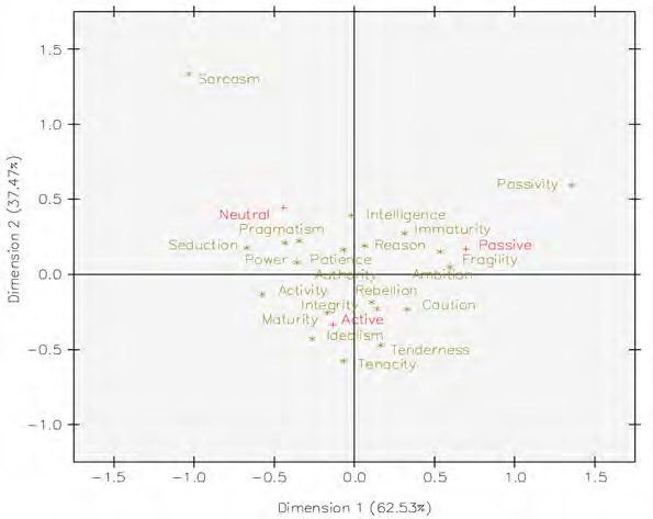An active role tended to be associated above all with stereotypes like tenacity (or stubbornness), idealism, activity or rebelliousness, i.e. to a series of personality traits that are intrinsically assertive, affirmative and proactive. Yet at the same time, this was also linked to other traits that involve greater reflection and reflexivity, such as maturity, tenderness, integrity and caution. On the other hand, a passive role in dealing with conflict was linked more closely to stereotypes that have passive connotations, such as fragility, immaturity or a passive nature. In this instance, apparently contradictory associations were formed, as the passive role is also linked to more positive and generally proactive traits like ambition, intelligence and reason.