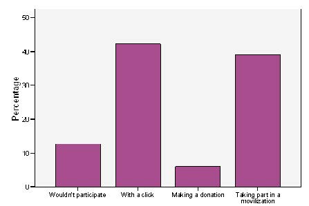According to the study results, the majority of young people continue to participate through clicks from their computers, but as we have just seen, the effects of these actions are far from negligible. This is combined with the significant percentage of young people who seem to be involved in social and civic actions, and who take their solidarity actions beyond a click. In addition, only 17% of the young people surveyed can be considered as passive since only that 17% states that they «would not participate» through the virtual world or the real world in any of the events included in the questionnaire. As a result, it can be deduced that this reflects the other side of the coin: the confirmation that more than 80% of young people participate in some way or another in the actions they are invited to through social networks. Therefore, social networks cannot be considered simply a passing trend. They are a fundamental change in how we communicate and interact in a global manner. The added value they have contributed to certain social movements cannot be ignored.
