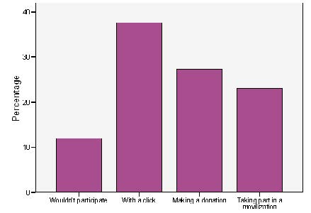 Something similar occurred when they were asked how they would participate in a humanitarian campaign against poverty in Spain or in a humanitarian campaign against poverty in Africa. In both cases, 38% responded «with a click», but the difference was made apparent in terms of transferring their solidarity beyond social networks. In that case, only 13% would go to an offline engagement for a campaign to fight poverty in the African continent, while 23% said they would go to an engagement if the campaign was to fight poverty in Spain.
