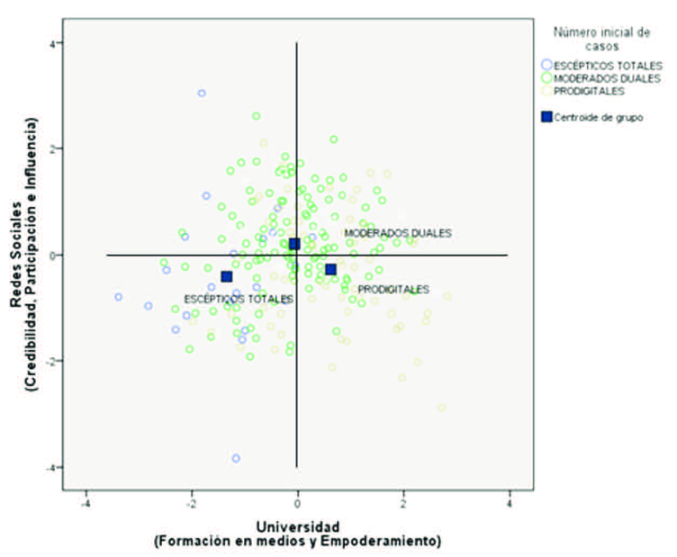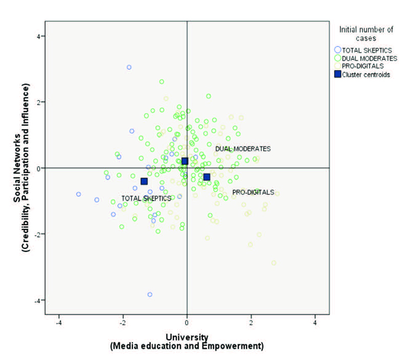By means of a graphic representation of cluster centroids (Graph 1) –obtained through a discriminant analysis of the groups– we gained an overall view of the main differences between the types identified. “Total sceptic” students, with negative scores in both factors (social networks and University), “dual moderates”, with a more positive view of the university but who are less active in social networks, and “pro-digitals” who are confident in their ability to influence in social networks, but not because of the university’s contribution to their training.