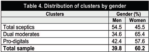 The last group, consisting of 31.02% of the sample, has been labeled the “pro-digitals”, as they score the highest in all matters related to social networks and the opportunities these provide for participating in and influencing their surroundings. In spite of this, “pro-digital” students again show clear wariness about the educational role of the university, with scores that place them in close proximity to “total sceptics”.