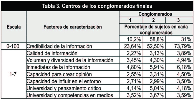 Para la identificación de los grupos de sujetos homogéneos se tomaron como variables activas las agregadas que resultan de la depuración de los ítems. El algoritmo K Medias, tras un proceso de siete iteraciones, emitió una solución final de tres conglomerados con unas puntuaciones medias en los principales factores de caracterización sensiblemente diferentes (Tabla 3).