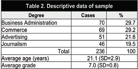 In this way, we carried out an exploratory study using as material for the empirical part of this work the information collected from a sample of 236 university students in degree programs of Commerce, Journalism, Advertising and Business Administration at public universities. These degree paths were chosen because they all include courses on communication, which familiarizes participants with the potential of social networks. The sampling method used was by clusters, with classes used as sampling units. The field work was conducted between 15th and 25th October 2016.