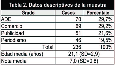 De este modo, procedemos a desarrollar un estudio exploratorio empleando como material para la parte empírica de este trabajo la información recogida de una muestra de 236 estudiantes universitarios de los Grados de Comercio, Periodismo, Publicidad y ADE de la universidad pública. La elección de los Grados se justifica en que todos ellos incorporan asignaturas de comunicación lo que familiariza a los participantes con la potencialidad de las redes sociales. El método de muestreo aplicado fue por conglomerados, utilizando las clases como unidades muestrales. El trabajo de campo tuvo lugar entre los días 15-25 de octubre de 2016.