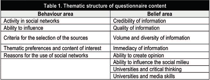 Área de creencias: relativas a la información producida y consumida en las redes sociales por los universitarios. Percepción de la información que circula en las redes, credibilidad de los contenidos, importancia de la inmediatez de la información, la mediación de los contenidos, importancia y significado de la contrastación de la información. Consciencia sobre la capacidad de influencia, autopercepción de su grado de conocimiento, destreza y habilidad en el manejo de las nuevas herramientas de comunicación y de la formación que reciben en el entorno universitario para habilitarles a participar como ciudadanos efectivamente empoderados.