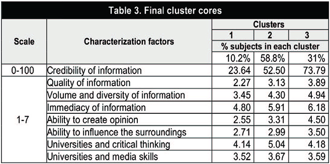 The aggregates yielded by the cleaning up of the items were used as the active variables for the identification of groups of homogeneous subjects. The K means algorithm, after a process of seven iterations, issued a final solution of three clusters with significantly different average scores in the main characterization factors (Table 3: see next page).