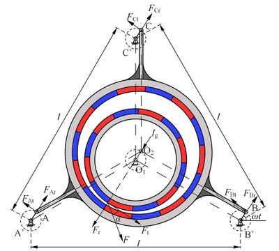 In Figure 2, crank AA', crank BB' and crank CC' represent eccentric high-speed shaft 1, 2 and 3, respectively. and are the radial electromagnetic force and tangential electromagnetic force of low-speed permanent magnet ring and ring-plate permanent magnet ring respectively; , , , , and are the radial force and tangential force of each eccentric high-speed shaft acting on the ring-plate bearing seat hole through rolling bearing; is the inertial force on the ring-plate permanent magnet ring; is crank rotation time and is the rack spacing.
