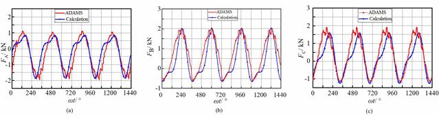 According to the analysis results of the TRMG dynamics model, input shafts A, B, and C are given input speed r/min, and the output shaft is given load torque of 124N·m.The multi-body dynamics simulation and analytical calculation data curves of the forces acting on input shafts A, B, and C are obtained, as shown in Figure 12.