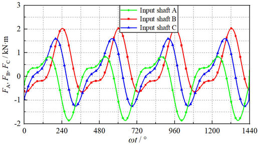 By substituting Eqs.(16)-(18) into MATLAB transmission force analysis program, the force variation curves of input shafts A, B, and C shown in Figure 11 can be obtained.