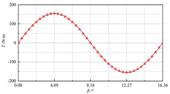 As can be seen from Figure 4, the electromagnetic torque curve of low-speed permanent magnet ring is a sine wave. When it rotates 1/2 and 3/2 magnetic pole angles, the maximum output electromagnetic torque is . In this paper, the load torque is 125N·m.