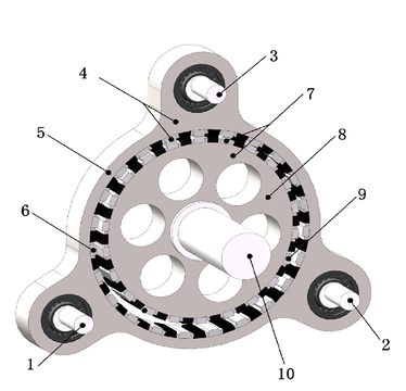 | 1-3: Eccentric high-speed shaft. 4: Ring-plate permanent magnet ring. 5: Ring plate. 6: Outer ring permanent magnet. 7: Low-speed permanent magnet ring. 8: Inner yoke. 9: Inner ring permanent magnet. 10: Low-speed shaft |