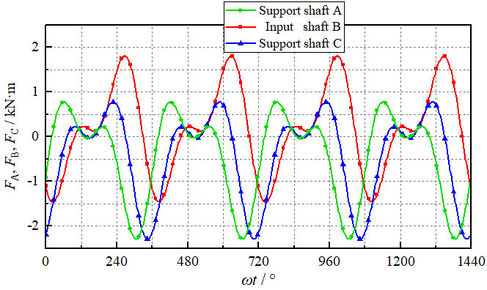 (1) When the cranks rotate, the force of the input shaft and the support shafts change periodically, and the varying degree of support shaft A and C is the same. According to Eq. (9), and are 0, shaft A and C are only TRMG connection structures, and both transmission process are the same, so the bearing force trends is the same.