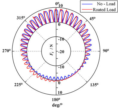Combined with Eqs. (3) and (4), the variation of radial electromagnetic force acting on low-speed permanent magnet ring with no-load and rated load can be obtained, as shown in Figure 7.