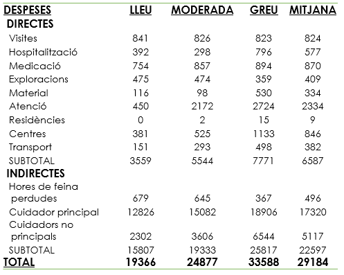 Com semblava obvi, l’evolució de la despesa varia en funció de la progressió de la malaltia. En fases inicials o lleus, la despesa indirecta supera la despesa directa, de manera que al voltant del 70% de les despeses deriven de la cura informal. En fases moderades o greus, la despesa pot provenir, en una part significativa, de la institucionalització, i això pot arribar a ser una part significativa de la despesa directa.