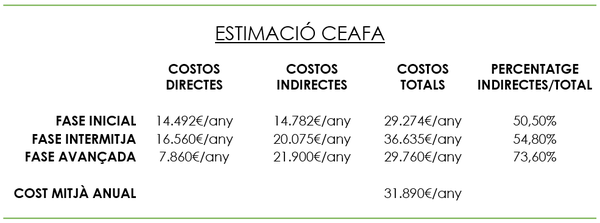 El desglossament dels costos directes i indirectes , per fases, segons l’estudi de la Universitat Complutense de Madrid i neuroalianza, es descriu en el gràfic següent: