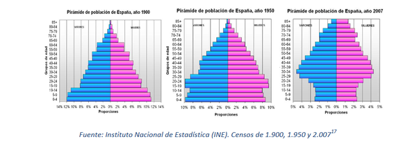 Una mirada a la taula sobre canvis en la piràmide poblacional espanyola dels anys 1900, 1950 i 2007 ens en donarà una idea: