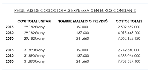Amb totes aquestes dades podem, doncs, establir un càlcul sobre el què representa i el què pot representar a Catalunya el cost de la Malaltia d’Alzheimer. Ho farem basant-nos en els 2 estudis que ens semblen més propers, i que donen unes xifres que, per al 2015, es situen en una forquilla entre els 29.182€/any (estudi neuroalianza) i els31.890€/any (estudi de la CEAFA)29:
