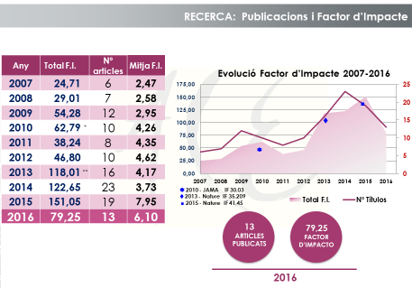 Fruït dels esforços en recerca bàsica, clínica i aplicada s’han generat quasi 200 articles sobre les demències en general, i la MA en particular, publicats en prestigioses revistes científiques, amb un factor d’impacte significatiu: