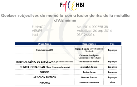El projecte FACEHBI (fundació ACE Human Brain Initiative). L’objectiu d’aquest estudi és identificar, mitjançant diferents tècniques diagnòstiques, els fenòmens fisiopatològics que apareixen en les persones anys abans que comencin a presentar els símptomes de la MA (en la fase preclínica de la malaltia). L’objectiu final és identificar les eines més útils que permetin fer un diagnòstic precoç per tal de poder implementar teràpies abans que el dany cerebral sigui massiu i irreversible.