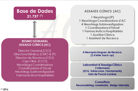 Aquest èxit de reclutament i participació (més de 1.000 pacients involucrats en els més de 100 assajos participats) també es deu a l’existència d’una base de dades, quantitativament significativa i qualitativament ben estandarditzada, que permet fer screening previ de candidats. El personal implicat, el volum de la base de dades s’expliciten en el següent gràfic: