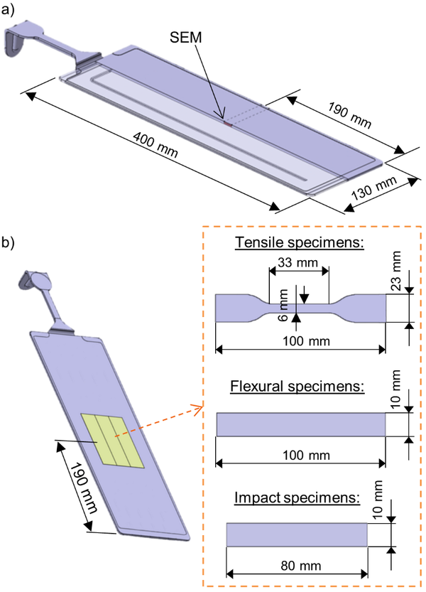 The PP 20GF compound was pre-dried at 80 ºC for a minimum of 3 hours, as recommended by the supplier. Rectangular plates of 400x130 mm2 (Figure 2) and variable thickness were injection molded through MuCell® and IQ Foam® processes, combined with the Core Back technology. First, solid and foamed 3 mm-thick plates were obtained, reducing the weight by 10% as compared to the unfoamed part. Then, two series of foamed samples combined with the Core back technology were injection molded, with an enlargement of the cavity from a basic wall thickness of 3 mm up to 3.3 mm and 3.7 mm.