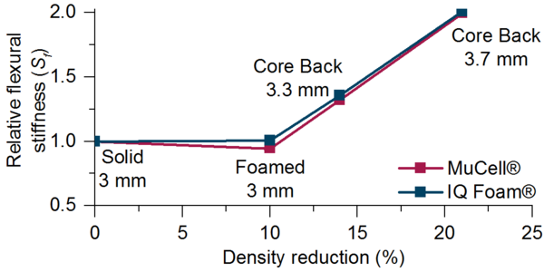 Where I is the moment of inertia, Ef is the flexural modulus and b and h the part width and thickness, respectively. Thus, flexural stiffness is significantly increased by the third power of the thickness. Figure 6 illustrates the evolution of the relative, flexural strength by foaming and increasing thickness with Core Back technology. It should be noted that despite the drop in flexural modulus, the stiffness was improved up to 200% as compared to that of the solid counterpart by increasing the thickness to 3.7 mm.