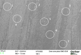 Observando con microscopía electrónica (SEM aumento x 100), una muestra aleaoria de 7 puntos localizados en la misma área en la que previamente se utilizó la lupa binocular, no se ha apreciado la presencia de una porosidad signiifcativa. En la Figura 15 se muestra el mapeado de los puntos seleccionados.