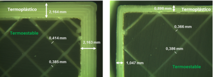 Para mejorar las propiedades mecánicas y de resistencia térmica de las muestras impresas, se ha estudiado su hibridación con resina termoestable catalizada. La hibridación con resina termoestable catalizada de las piezas impresas se ha propuesto como una estrategia para aumentar su respuesta mecánica y térmica por encima de los valores que se conseguirían únicamente mediante la impresión 3D de piezas sólidas no hibridadas. Para realizar la hibridación, se ha aprovechado las capacidades de los softwares de laminación de impresión 3D para generar piezas impresas con distintos patrones y porcentajes de densidad de relleno, altura de capa, valores de espesor de piel y de espesor de pared lateral.