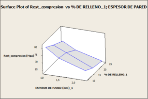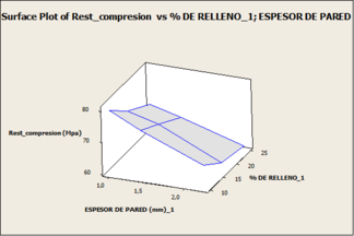 Se ha observado que, en la estructura híbrida, que el aumento del porcentaje de relleno y del espesor de la pared lateral de la pieza impresa, influye negativamente en el valor de la resistencia a la compresión de las piezas híbridas. Aplicando la metodología de superficies de respuesta (MSR) se obtienen las gráficas con las que se comprueba visualmente como afecta a la resistencia a la compresión, el valor de las variables estudiadas en el diseño de experimentos. La superficie de respuesta para el modelo rectilíneo y el modelo octogonal se muestra respectivamente en la Figura 6 y la Figura 7. Las condiciones más favorables para obtener el mejor comportamiento en compresión de las estructuras híbridas se producen en el intervalo del espesor de pared de entre 1 mm y 1,4 mm y el porcentaje del mallado de relleno entre el 10% y el 15%.