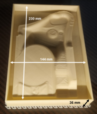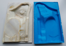 El molde híbrido elaborado se muestra en la Figura 8. Consta de un semi molde rígido impreso en PC/ABS hibridado con resina termoestable catalizada, y de un semi molde de elastómero de silicona, que se cierra sobre el semi molde híbrido rígido. El semi molde elastómero tiene la función de repartir uniformemente y reducir la presión de moldeo necesaria para conformar las piezas de composite que se moldearán con el molde. El molde se ha diseñado para elaborar piezas de 2,5 mm de espesor.