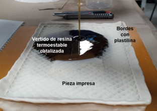 El molde híbrido para el moldeo de composites se ha construido con dos mitades formadas por un lado con un semi molde impreso en PC/ABS e hibridado por colada con resina termoestable catalizada, y por otro lado un semi molde elastómero realizado por colada con silicona. En la Figura 3 se muestra la etapa de hibridación de la parte termoplástica impresa del molde.