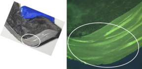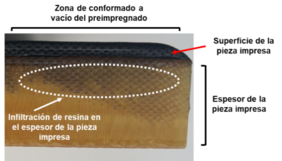 Se podría evitar recurrir al empleo del film de desmoldeo habiendo tratado con un recubrimiento sellante la huella termoplástica del molde. Al moldear un composite sobre la superficie impresa, se puede producir la infiltración de la resina del composite en la misma, tal y como se observa en la Figura 12 en la que trabajando con una superficie de alta resistencia térmica impresa en PEI, se ha aplicado un preimpregnado epoxi mediante vacío a 120ºC.
