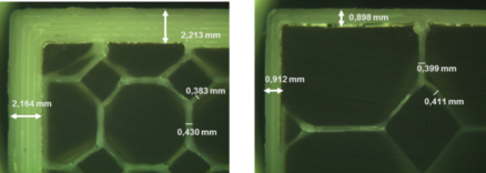 Obervando con lupa binolcular la sección de las piezas hibridadas se aprecia buena interrelación entre el mallado del patrón de relleno de la resina termoplástica de PC/ABS y la resina termoestable polimerizada. No se observa pososidad interna, ni falta de unión entre el mallado de relleno y la resina termoestable añadida. En la Figura 4 se muestra el resultado para el patrón rectangular, y en la Figura 5 se muestra el resultado para el patrón octogonal.