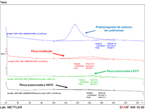 Se ha medido que el grado de polimerización conseguido en las piezas obtenidas mediante la compresión con el molde híbrido. Se consigue un grado del curado por encima del 74%, valor obtenido al comparar las entalpias de curado o polimerización del preimpregnado antes (54,88 J/g) y después de su procesado (14,41 J/g). En la Figura 13, se comprueba que mediante la aplicación de un tratamiento térmico de postcurado se consigue incrementar el grado de polimerización de la pieza moldeada, consiguiéndose un grado del 89,9% después de un tratamiento en estufa a 65º C durante 24 horas, y un 91,7% si el tratamiento es de 160ºC durante 3 horas.