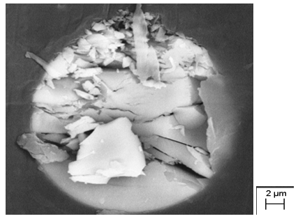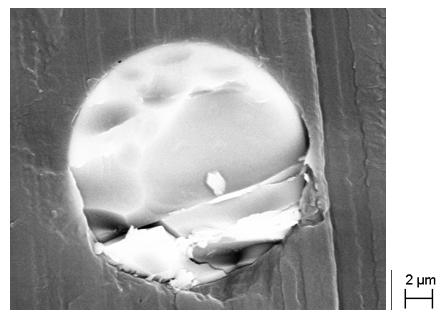 • Análisis con microscopía SEM de la interfase entre la resina termoplástica y el refuerzo de fibra de vidrio. Uno de los criterios de selección de los refuerzos se basará en la buena unión entre la resina y el refuerzo.