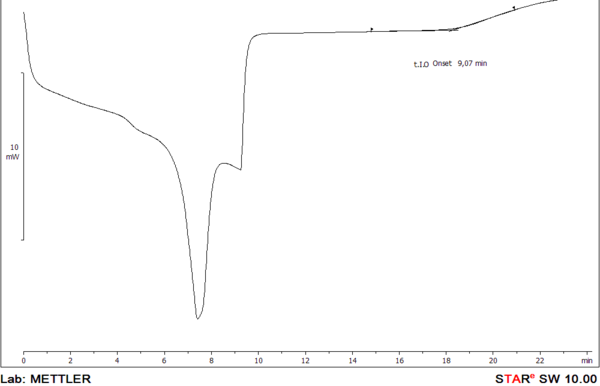 Otro aspecto tenido en consideración a la hora de diseñar la composición de los organosheets ha sido la evaluación de la resistencia a la oxidación de las formulaciones termoplásticas, teniendo en consideración que en los procesos de laminación las formulaciones deben soportar temperaturas de entre 210 – 240 ºC durante periodos de tiempo que pueden alcanzar los 2 minutos. Los tiempos de oxidación se han determinado mediante calorimetría diferencial de barrido. Los resultados obtenidos se muestran gráficamente, correlacionándose las temperaturas del ensayo con el tiempo en el que se produce la oxidación. Las formulaciones que no sufran oxidación dentro de los márgenes habituales del tiempo de laminación serán admisibles. A continuación se muestra un ejemplo de gráfica obtenidas en la caracterización de proceso de oxidación sufrida por la formulación termoplástica.