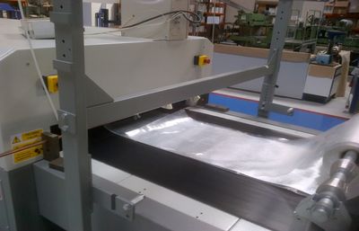 Finalmente, para asegurar la productividad del proceso, se han realizado pruebas en prensas de doble cinta. Por este motivo, se realizaron pruebas de consolidación de laminados en prensas dinámicas de doble cinta a presiones superiores como vía para conseguir composites con propiedades mecánicas equivalentes a las obtenidas mediante la compactación de capas en prensa.